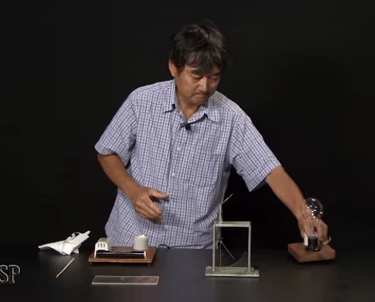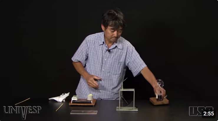 Neste experimento, demonstra-se o efeito fotoelétrico, fenômeno em que fótons de alta energia arrancam elétrons de uma superfície metálica. Um canudo eletrizado carrega um eletroscópio, que permanece carregado quando iluminado por uma lâmpada incandescente, mas se descarrega rapidamente ao receber radiação ultravioleta de uma lâmpada de vapor de mercúrio. Isso ocorre porque os fótons UV têm energia suficiente para liberar elétrons, confirmando a explicação de Albert Einstein (Prêmio Nobel de 1921) sobre a relação entre energia e frequência da luz.